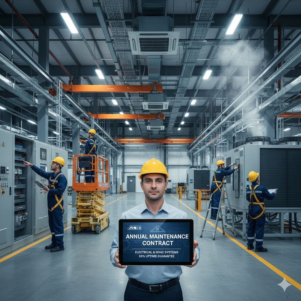 Annual maintenance contract for electrical systems and AC units in a manufacturing facility, ensuring 99% uptime.