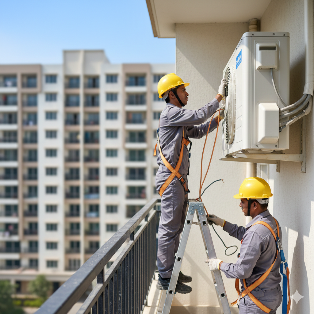 Installation of 50+ split AC units across a residential society with centralized electrical load management system.